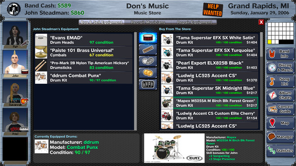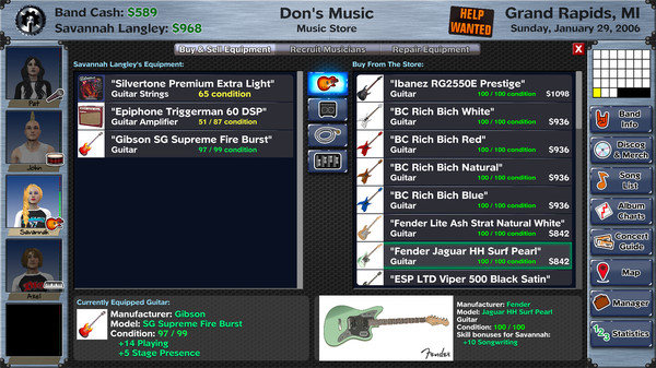 Customize your band with tons of clothing and hair styles, as well as hundreds of different kinds of equipment. You can even get a custom paint job on your band van, photoshoots with your band mates, and buy art to decorate your homes.
