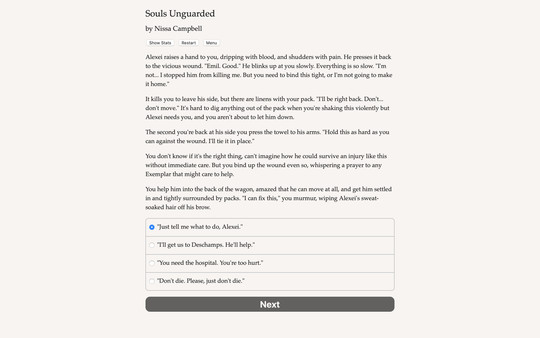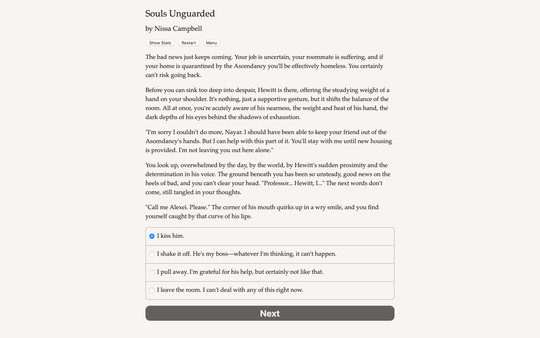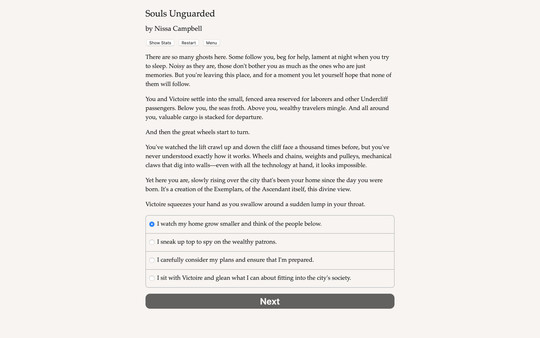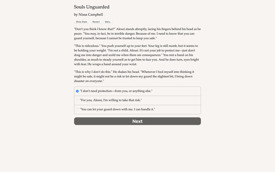 Souls Unguarded is an interactive dark fantasy romance novel by Nissa Campbell, author of the 2016 hit Heart of the House, where your choices control the story. It's entirely text-based, without graphics or sound effects, and fueled by the vast, unstoppable power of your imagination.