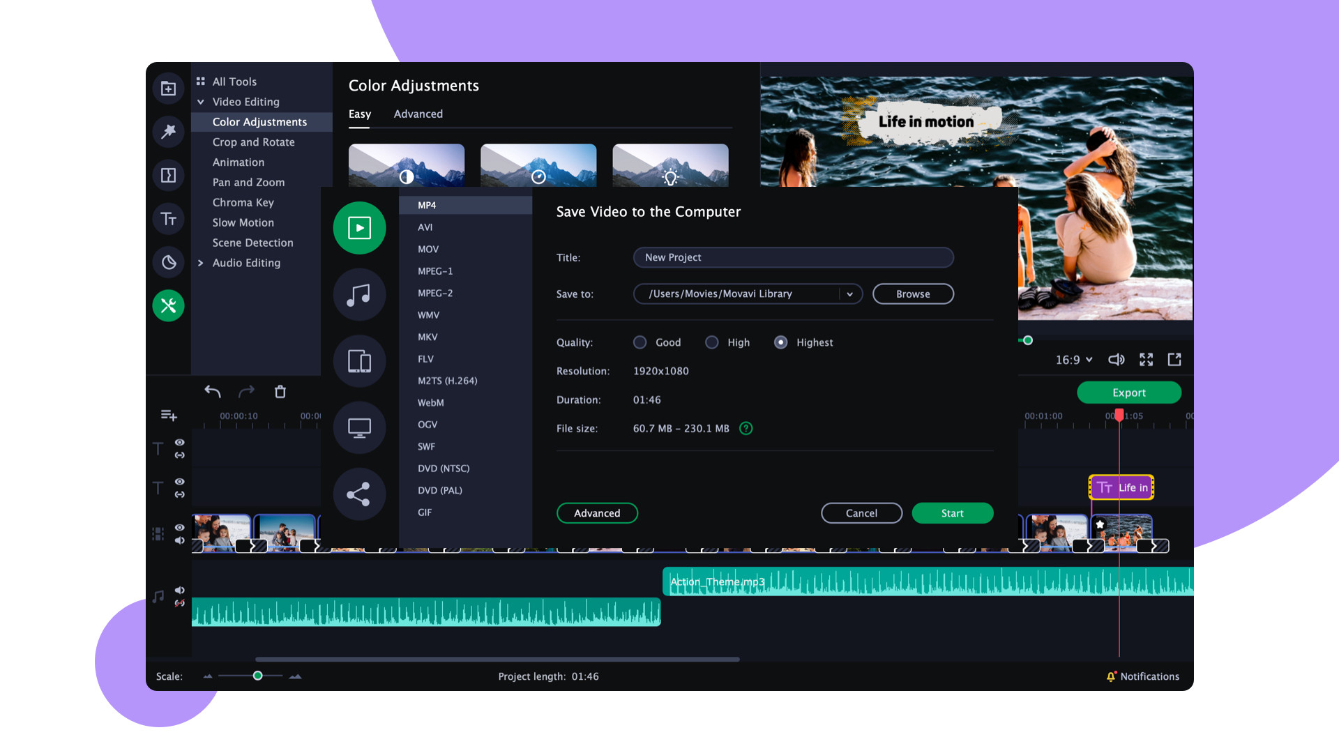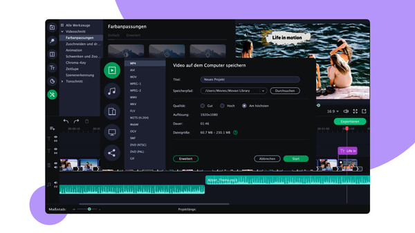 Nachdem die Pr?sentation abgeschlossen ist, speichert Movavi Slideshow diese auf Ihrem Computer. W?hlen Sie eines der g?ngigen Formate wie AVI, MOV oder MP4 oder ?bertragen Sie Ihr Filmmaterial direkt auf Ihr Ger?t. Sie k?nnen Ihr Video auch mit Freunden teilen und direkt aus dem Programm heraus sofort bei YouTube hochladen.