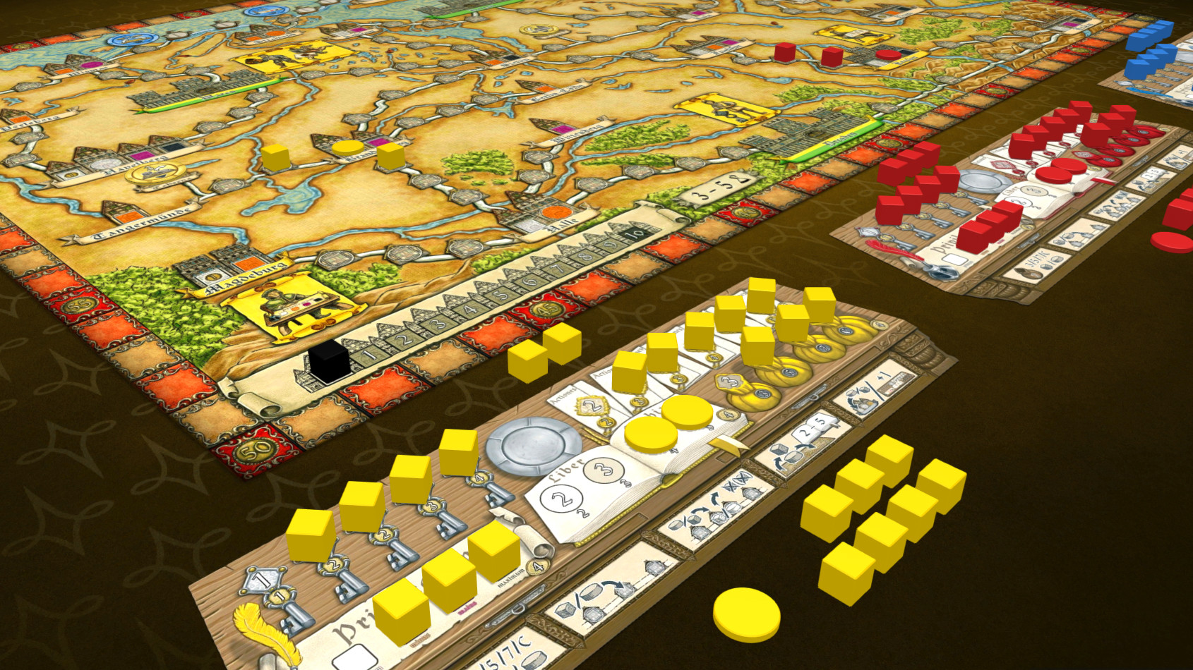 Players attempt to increase their standing as merchants in the Hanseatic League by gaining prestige points. This may be done in different ways: Establishing a network of Kontors in new Hansa cities may be as promising as improving trading skills.