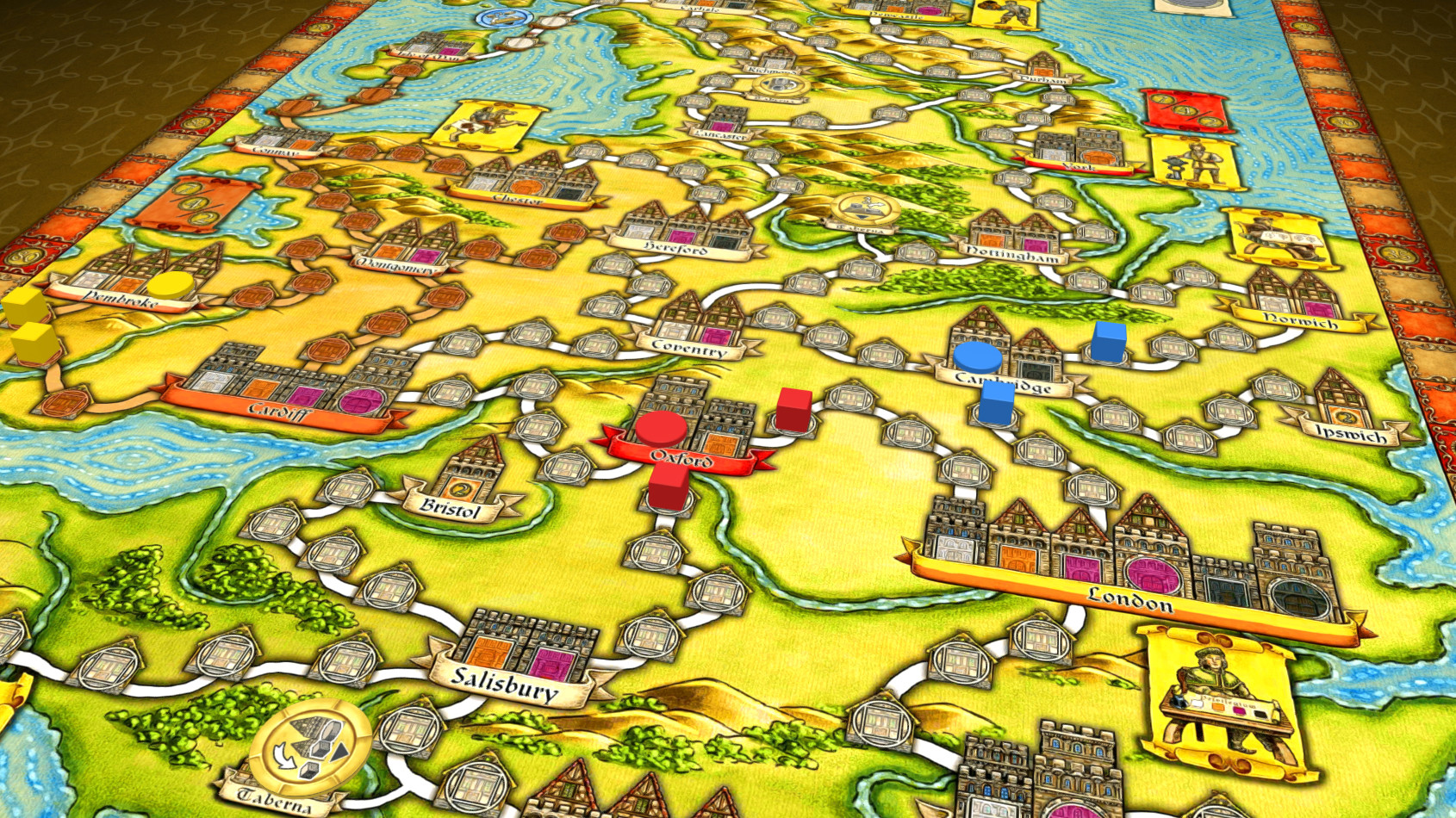Players accomplish various activities during their moves. Traders may be inserted on the gameboard, moved, or even displace traders from other players. If they eventually occupy an entire trade route between two cities, a new Kontor may be established. But players may also develop their trading skills instead in particular cities, improving their abilities throughout the course of play. Winner of the game is the player who gains most prestige points.