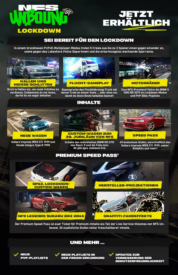 - VOL. 9: LOCKDOWN ? Geh aufs Ganze mit deiner Crew. Brich mit dem ersten Motorrad von NFS in Hallen ein und schnapp dir die coolen Schlitten darin sowie den vollst?ndig anpassbaren Subaru Impreza WRX STI ?99 und den Honda Integra Type R ?98.