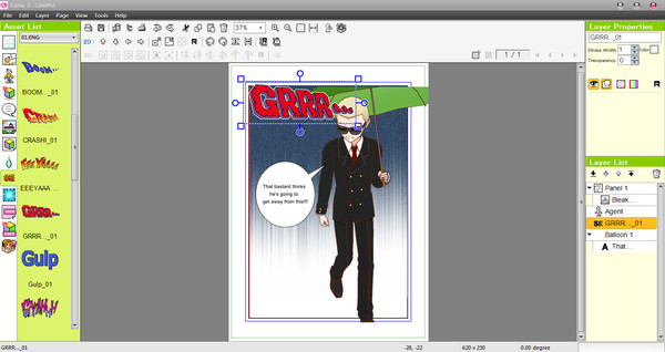 Additionally, you can use icons called Comic Marks. You can show the character's feelings by adding Comic Marks and Sound Effects. There are many Sound Effects in the assets menu. Various Japanese Sound Effects are available too!