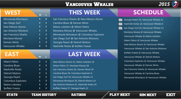 - guide your team through a 15 game regular season + playoffs. Before each game, choose to play or sim ahead to the next week.