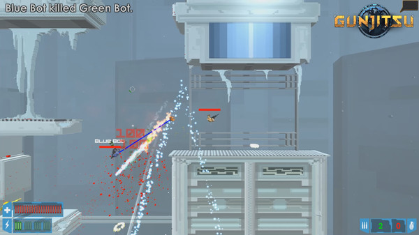 Gunjitsu is a fast-paced 2.5D Multiplayer Platform Shooter, where players fight out hectic gunfights in fully destructible levels. Apart from a range of crazy weapons the game features a unique grappling hook mechanic and different styles of jumps that allows players to navigate the levels, dodge bullets and make insane headfirst assaults.Gunjitsu is a game of skill and reflex, and all about keeping your cool. Learn to use the hook to assault and evade, learning to curve rockets, make precise shots, to cover your opponents in hails of well aimed bullets, or to make devastating fly-by attacks. Be the fastest on the trigger, the most acrobatic with the hook. Learn to aim and time your shots like a pro, or outmanoeuvre your opponents with lightning fast hit-and-run attacks. No matter how you choose to fight, these are all parts of mastering the art of Gunjitsu.