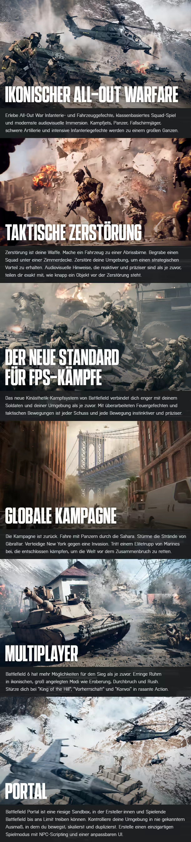 Das ultimative All-out Warfare-Erlebnis. Trage intensive Infanteriegefechte aus. Beherrsche den Himmel in Luftk?mpfen. Zerst?re deine Umgebung f?r einen strategischen Vorteil. Kontrolliere jede Aktion und Bewegung mit dem Kin?sthetik-Kampfsystem. In einem Krieg mit Panzern, Jets und riesigen Arsenalen ist dein Squad die t?dlichste Waffe. Das ist Battlefield 6.