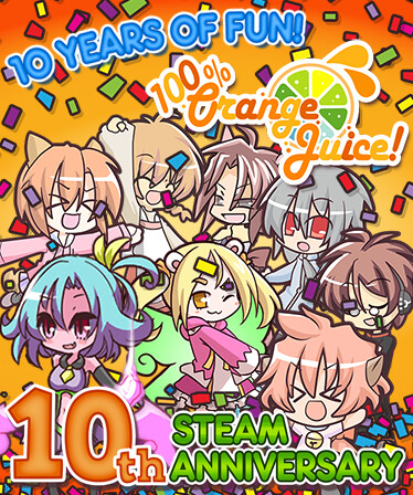 100% Orange Juice is a digital multiplayer board game populated by developer Orange Juice's all-star cast. Characters from Flying Red Barrel, QP Shooting, Suguri and Sora come together with all-new characters to duke it out... with dice.