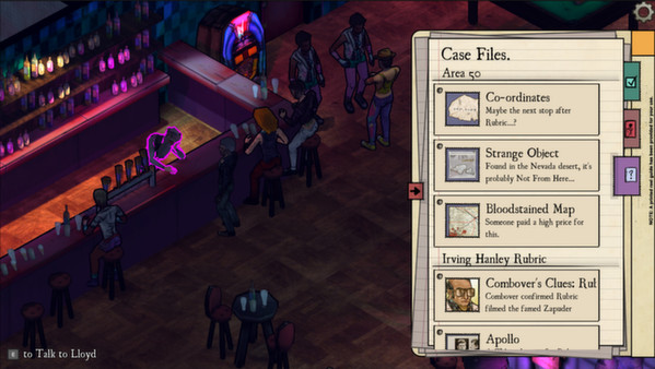 With fast, light mechanics, the game has been developed to engross players in a shadowy world of conspiracy with an over-the-top 1980s aesthetic. Players will use wits, stealth and sometimes even a little force to investigate, explore, and acquire ever more clues for their big string-covered wall of conspiracies.