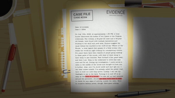 While searching for the fabled "Widow of the Woods" during an investigation, you stumble across a cabin in the middle of seemingly nowhere. Trapped inside, you must survive for five nights until the police can get to your location. Armed with nothing but a flashlight and a couple of trail cameras set up around the perimeter, you must avoid the clutches of the terrifying widow before it's too late.
