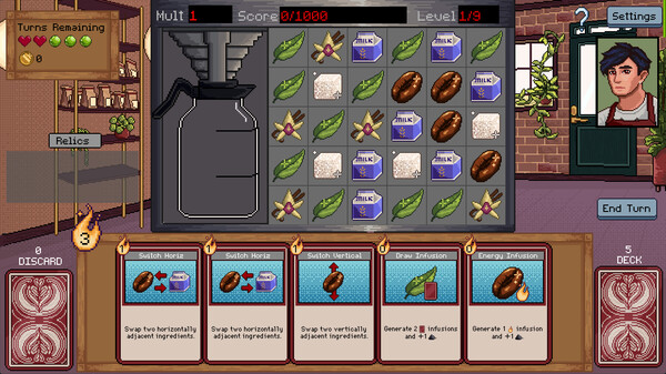 Hone your barista skills to smash daily goals and stave off the thirsty masses in this rogue-lite match-3 deckbuilder. Play your cards right to clear ingredients, beat increasingly demanding quotas, unlock passives, and make it through the work week.