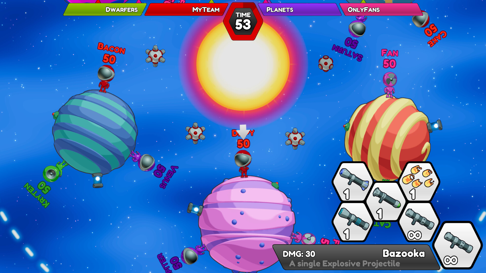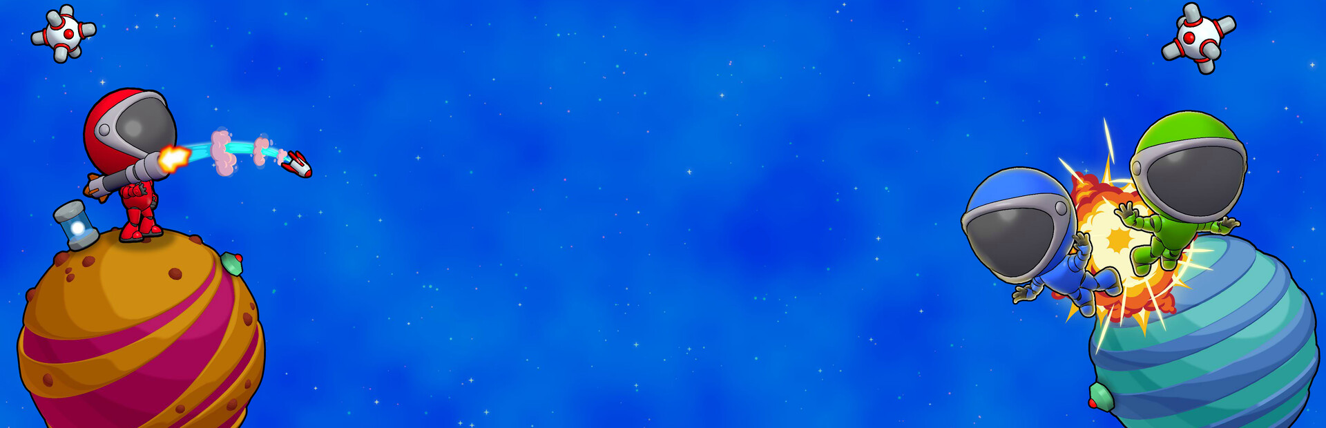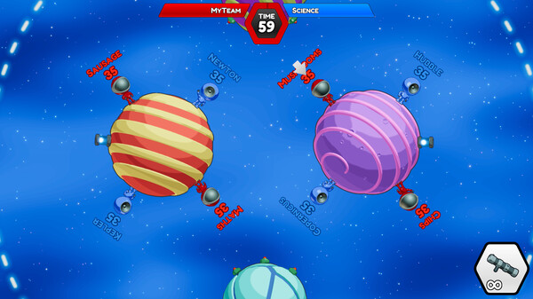 Nutze die Schwerkraft, um deine Sch?sse um Planeten und Asteroiden herum zu lenken. Zerst?rbare Planeten nehmen Schaden, wenn deine Raketen in sie einschlagen. Ihr k?mpft abwechselnd, bis nur noch ein Team ?brig ist.