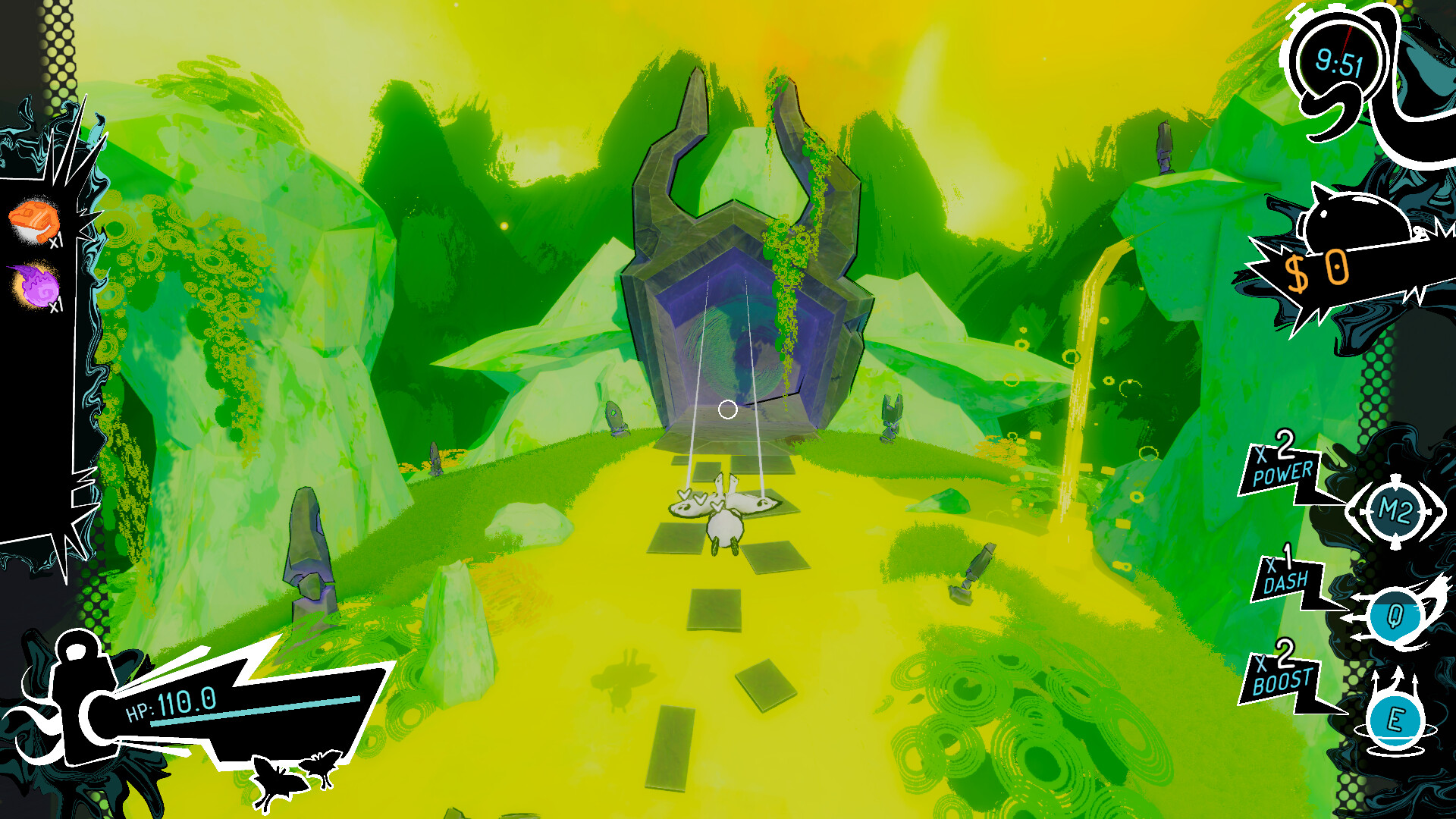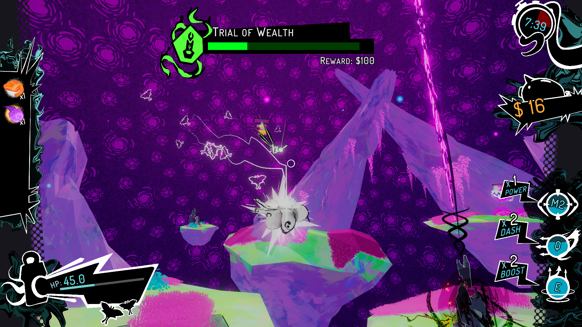 Time is of the essence as you explore island clusters scattered throughout 3 handcrafted areas! With a timer counting down to the arrival of a boss, blast away enemies and unlock streams that quickly bring you to neighboring islands. As you delve deeper and fight new foes, uncover the eldritch being at the center of this madness.