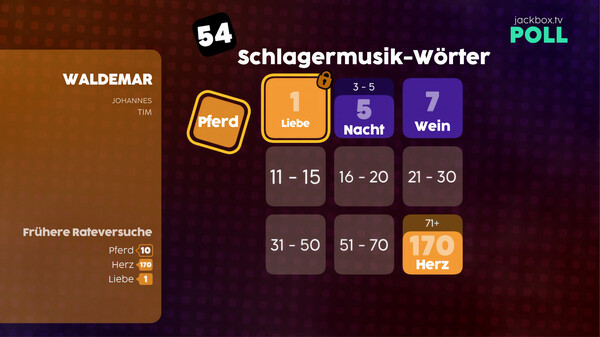 Jackbox hat ein brandneues Party-Erlebnis geschaffen! Mithilfe echter Umfragen von echten Leuten aus der ganzen Welt, ver?ndert The Jackbox Survey Scramble sich st?ndig anhand der Antworten, die von Spielern wie dir gegeben wurden! Lade Freunde, Familie, Mitarbeiter und Widersacher ein, um herauszufinden, wie sie Fragen wie diese hier beantworten: ?In einem Wort, was ist der s??este Kosename f?r Hintern?? oder ?In einem Wort, was ist die beste Garnierung f?r ein Sandwich??.