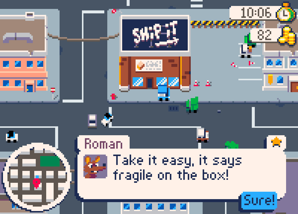 Explore vibrantly pixel art districts, take on the many different delivery challenges, and balance your time between earning cash, sniffing out clues, and interact with the townsfolk.