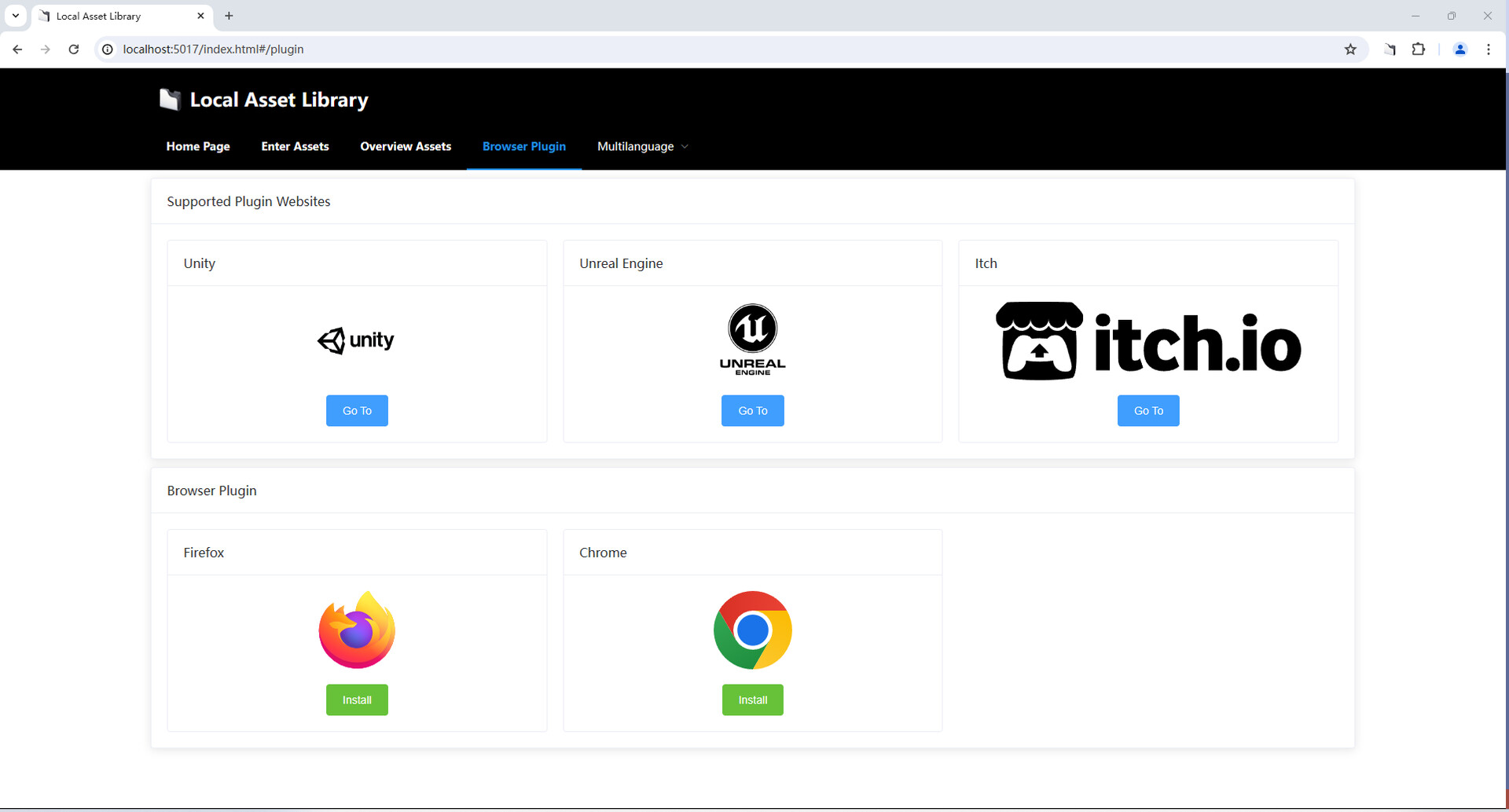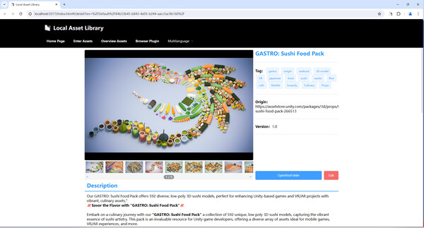 A browser plugin is provided to parse asset detail pages on game asset websites, allowing you to register selected asset information into this management tool with a single click, saving time and effort.