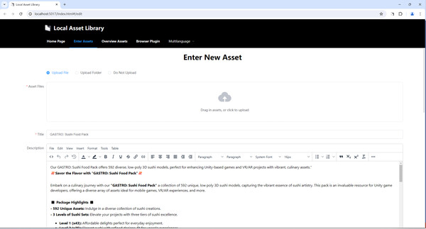 Asset Entry - You can input information for assets including title, cover, tags, files, description, version, and source. Missing information? No problem?the asset will still be entered, and any missing information will be automatically hidden when viewing.