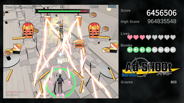 Fed up with unavoidable double ads before videos, the protagonist decides to enter a shooting game (shmup) where shooting down ads is the goal. Completing all stages promises an ad-free experience for a while, but is it really that simple?