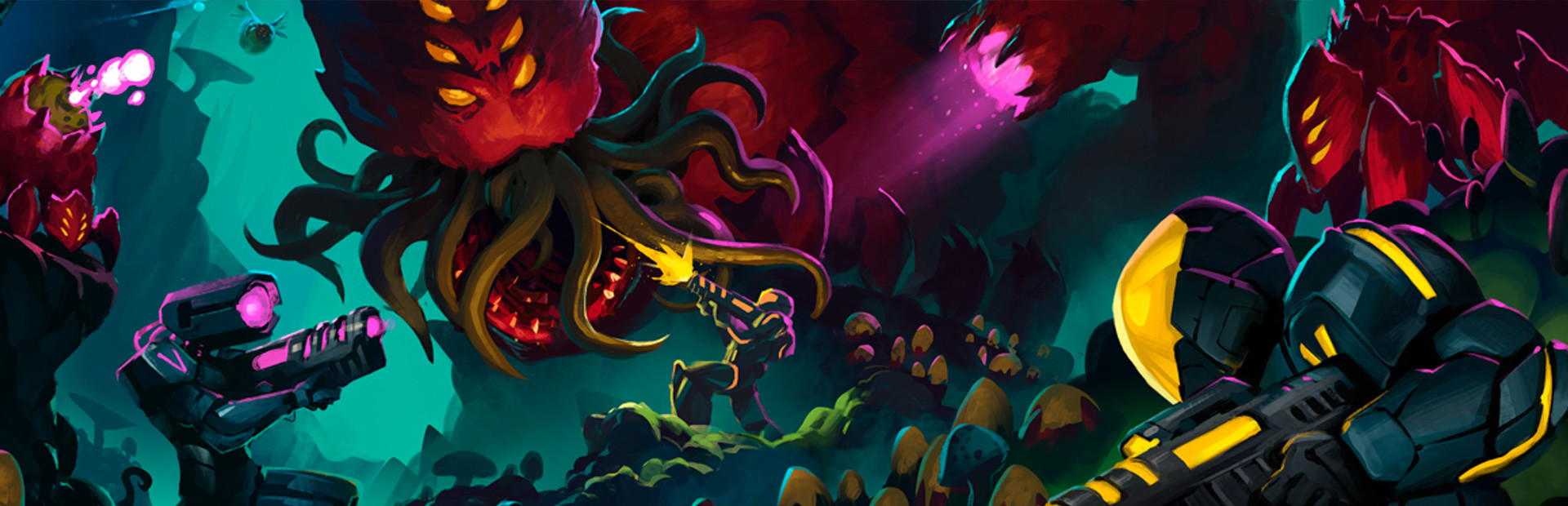 You and your friends assume the role of JUMPERS, and blast your way through procedurally generated alien hives in chaotic run and gun platforming action. Up to 4 Players band together in Local or Online Co-op to kill aliens, avoid traps, collect treasures and discover lost relics. Defeat fierce alien bosses to complete your mission and save the galaxy.