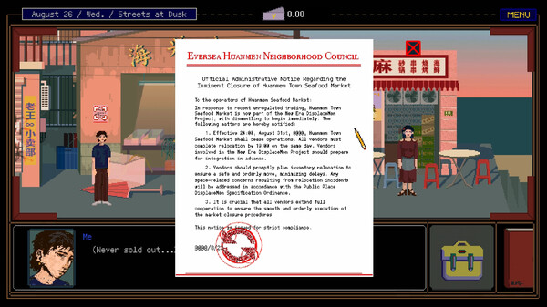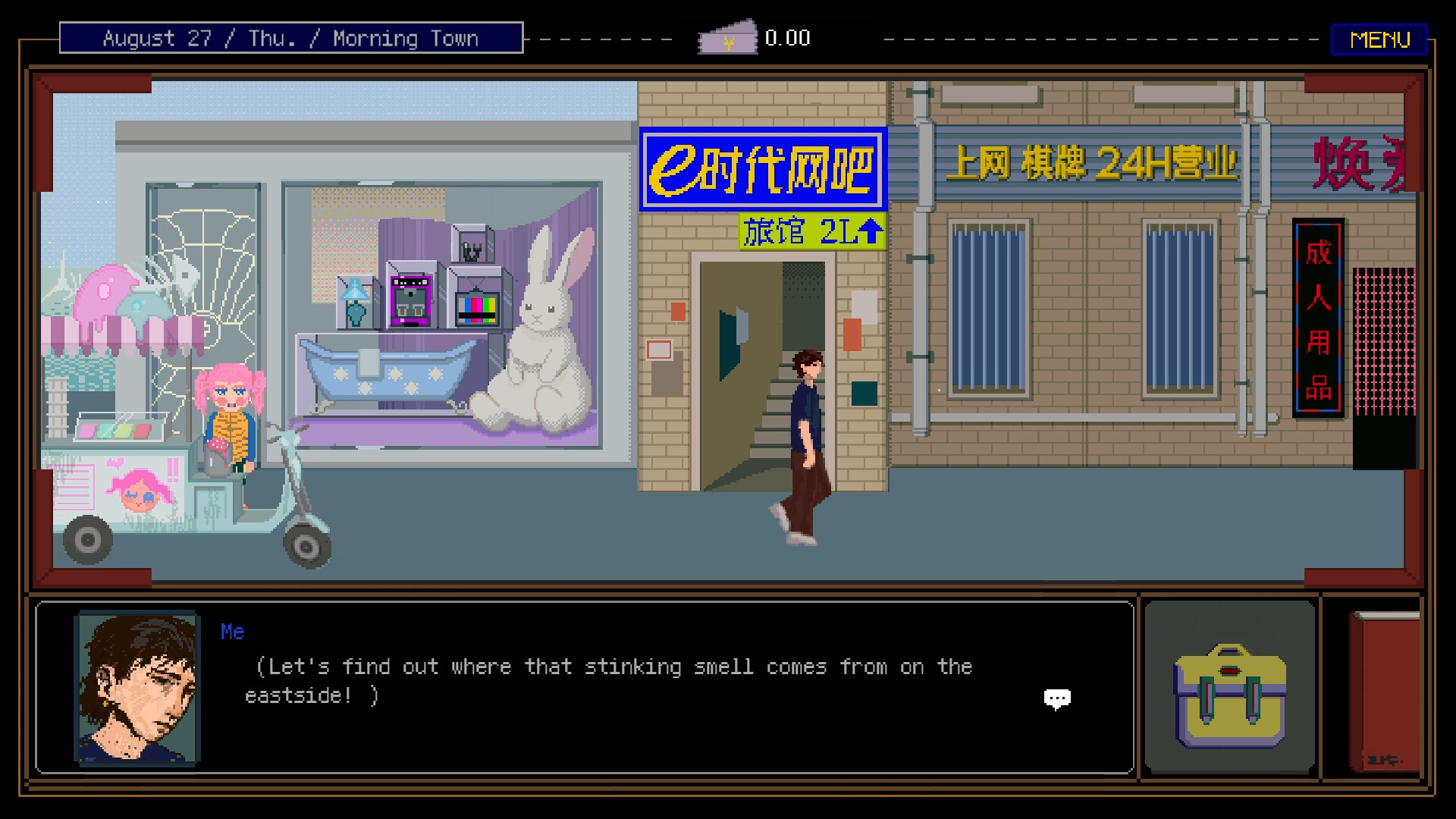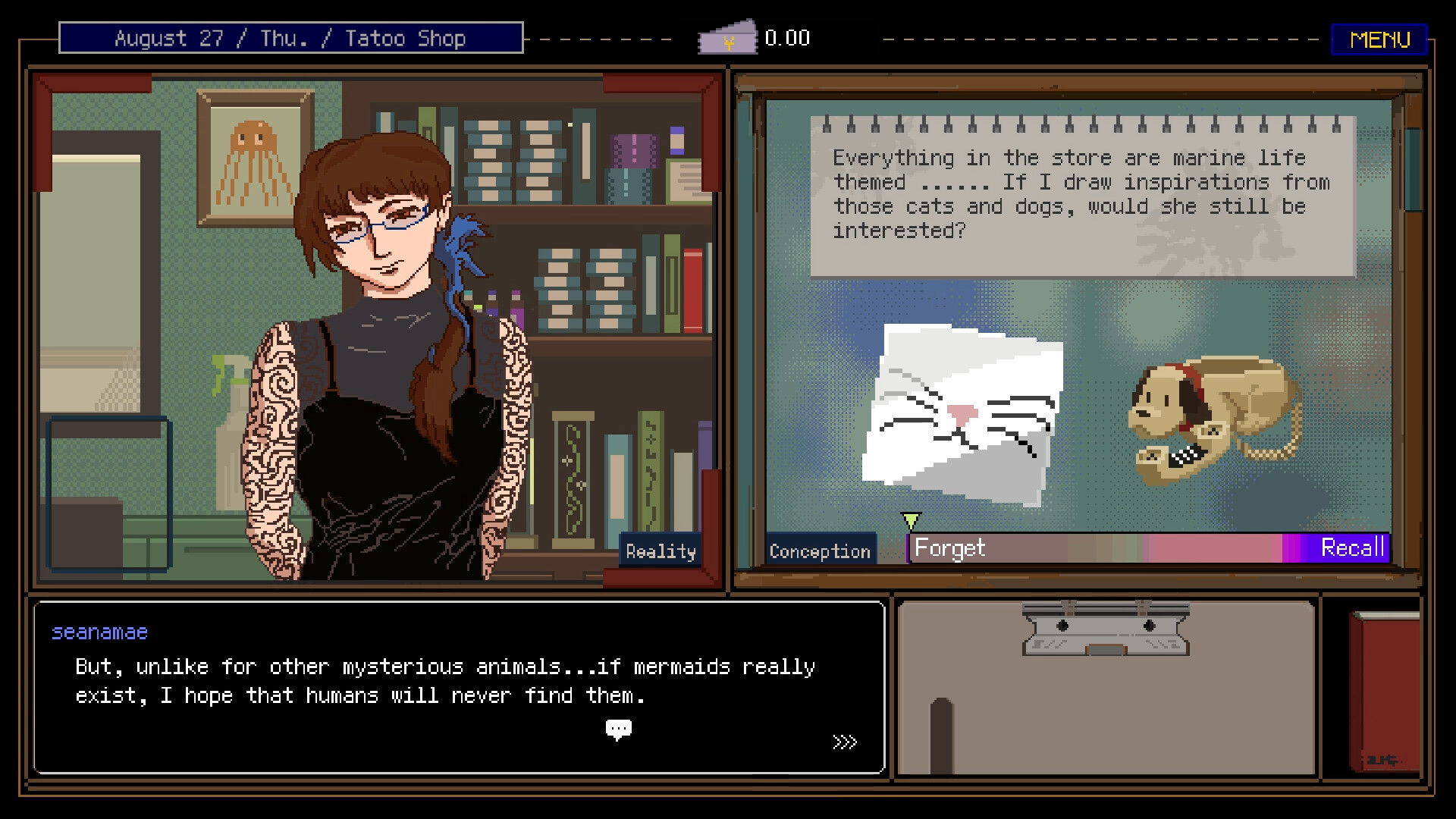 You are a broke painter who wanders around the town, collecting the strangest things to make art. While chatting with your commissioners, with a painter?s eye to observe and imagine, you will unveil the true faces of these people - the motivational speaker, the trace scholar with a day job as a tattoo artist, the hardcore cosplayer teenager, the wanted pseudoscientist, etc. Working to redeem the vanished ?mermaid,? you will accumulate properties until you realize you can displace people. Deciding what to let go of is a painter?s practice. Stay sensitive. Stay gold.