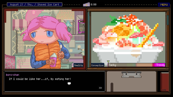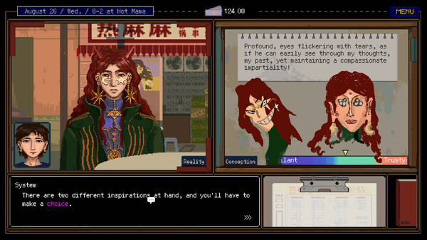 Imagine the most impossible found objects as art material. Observe your subjects and chat with your clients to uncover their secrets. Make artistic decisions to enable story branching. Balance special personal values for characters to activate unique painting results.
