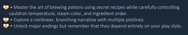 Visitors will come to you for advice or to buy potions to solve their problems. But will you choose to help them? After all, you can deceive or persuade your guests, steer them toward the light or the dark (depending on what benefits you the most), force them into servitude, or win them over with kindness. No one will judge you?this is your story! And not every healing potion will serve a noble purpose, nor will a tangle of tentacles always turn your guest into a true monster.