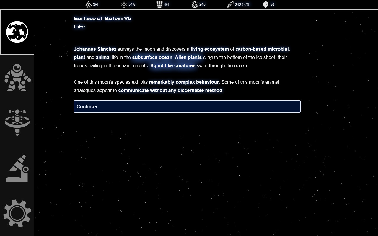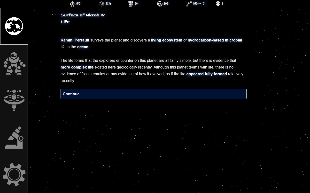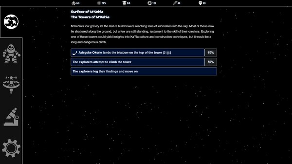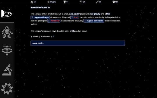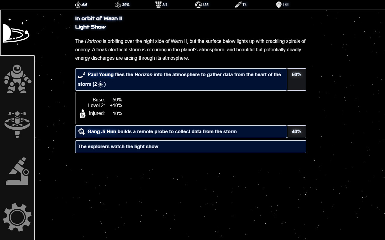 - Over a hundred random events including perils on strange worlds, encounters with life and civilisations, and your explorers' emotional journeys.