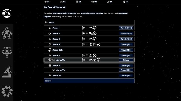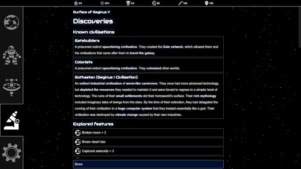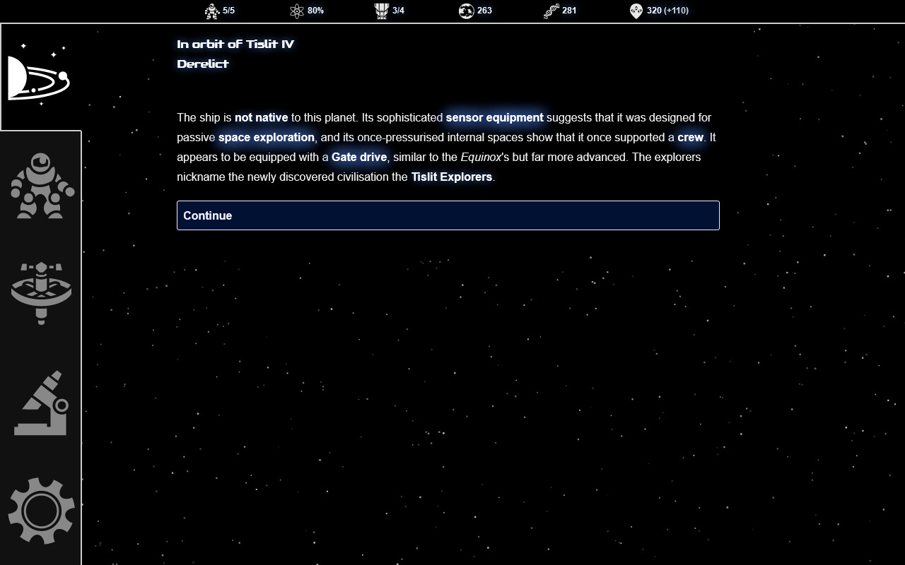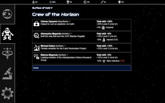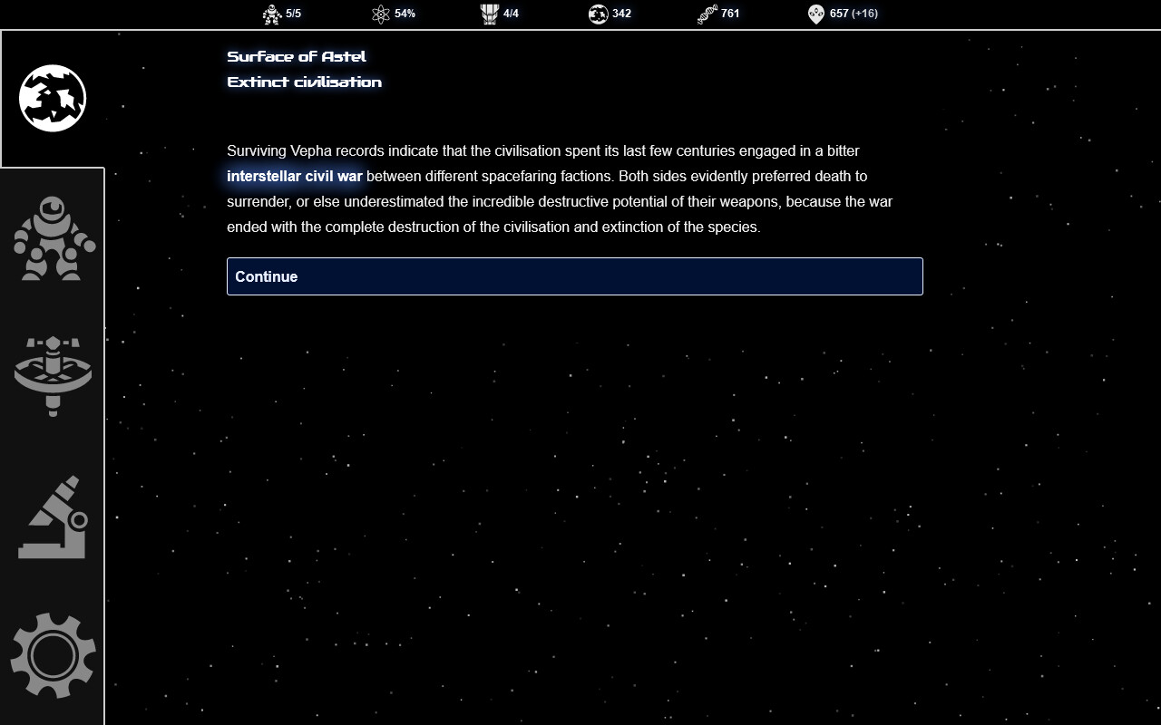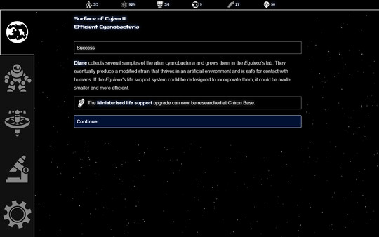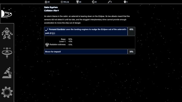 - Over a hundred random events including perils on strange worlds, encounters with life and civilisations, and your explorers' emotional journeys.