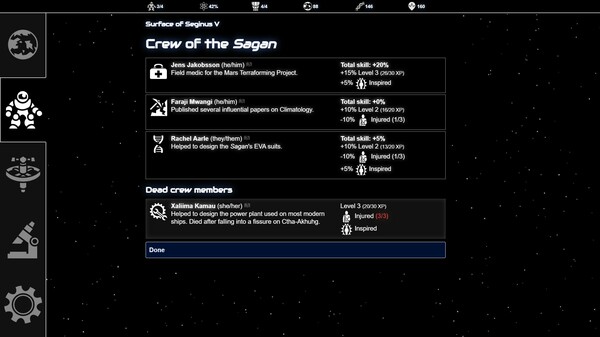 - Six explorer classes that unlock new options in events. Explorers level up, can be injured or die, and can become inspired or depressed.