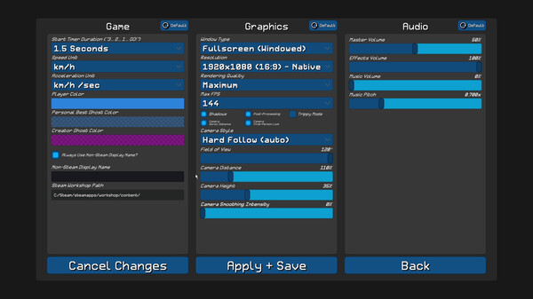 - Race replay files: autosaves your last 25, your personal bests for every level, and you can manually save any race you want. They can be viewed at any time, and slowed down or sped up.