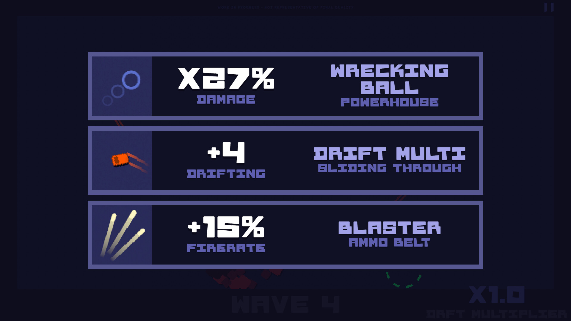 DRFT a silly, whacky drifting roguelike where you control a car that should not be controlled! Bouncing from walls, maintaining control all while frantically shooting at chasing enemies! Upgrade over-the-top weapons that wreck havoc to anything in their path and go even crazier when you drift around!