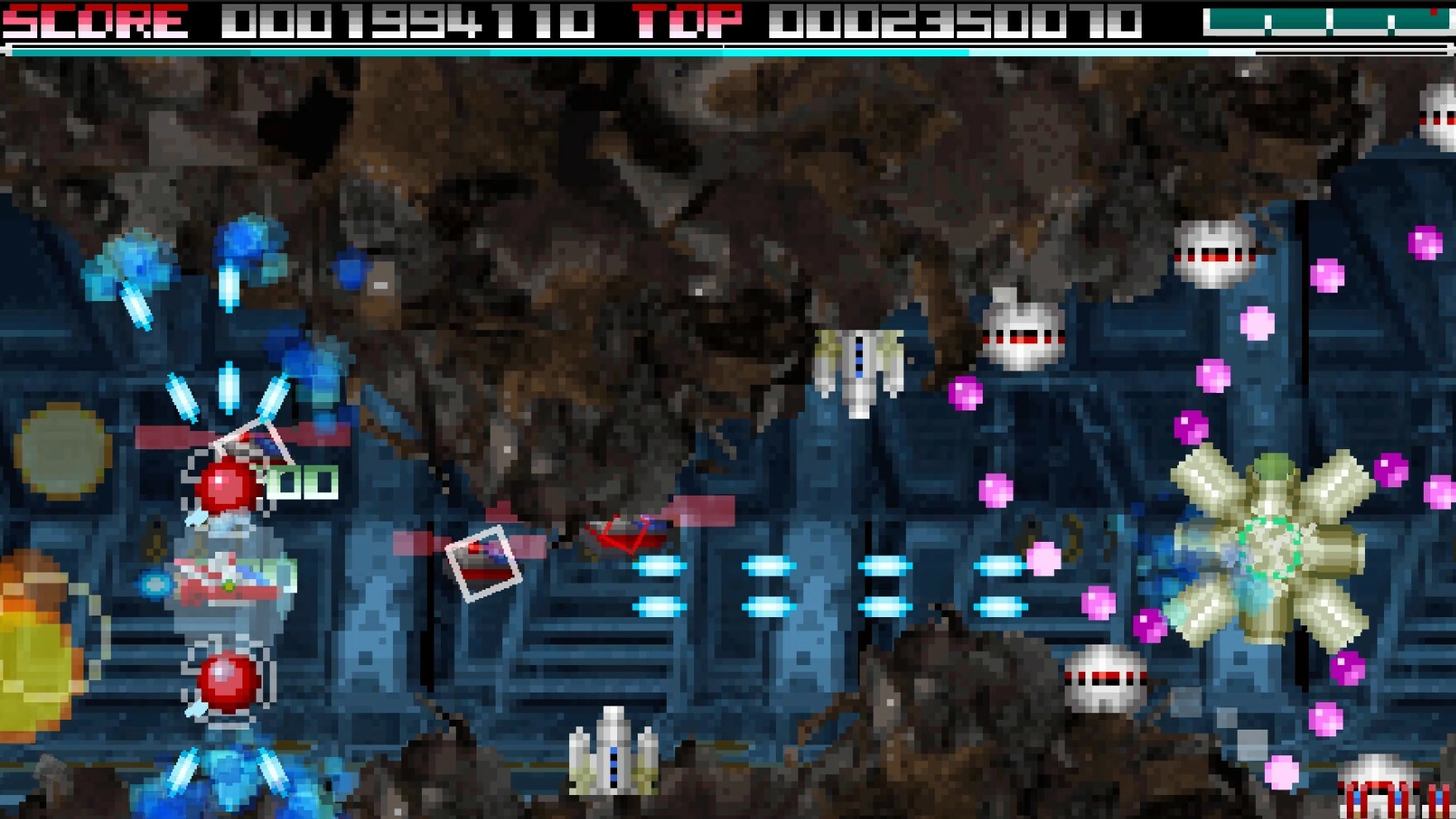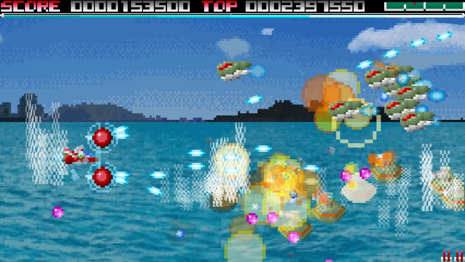During Double Hyper, your aircraft will attack you with guided bullets and your score will be 4x.