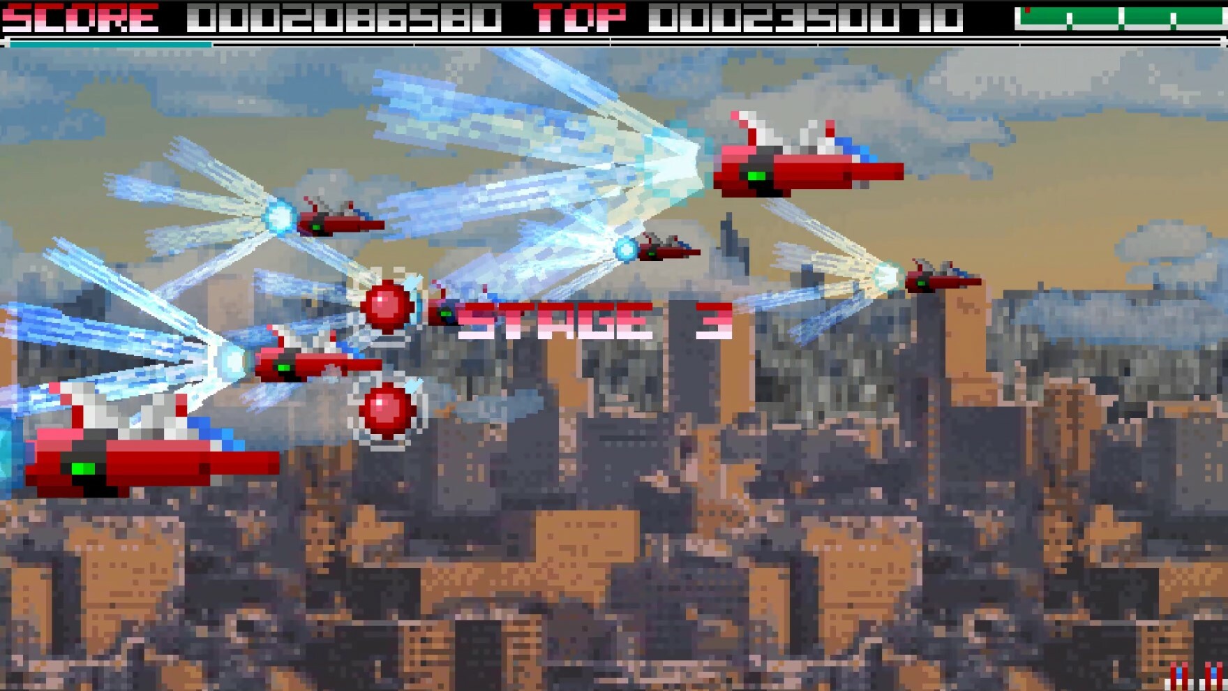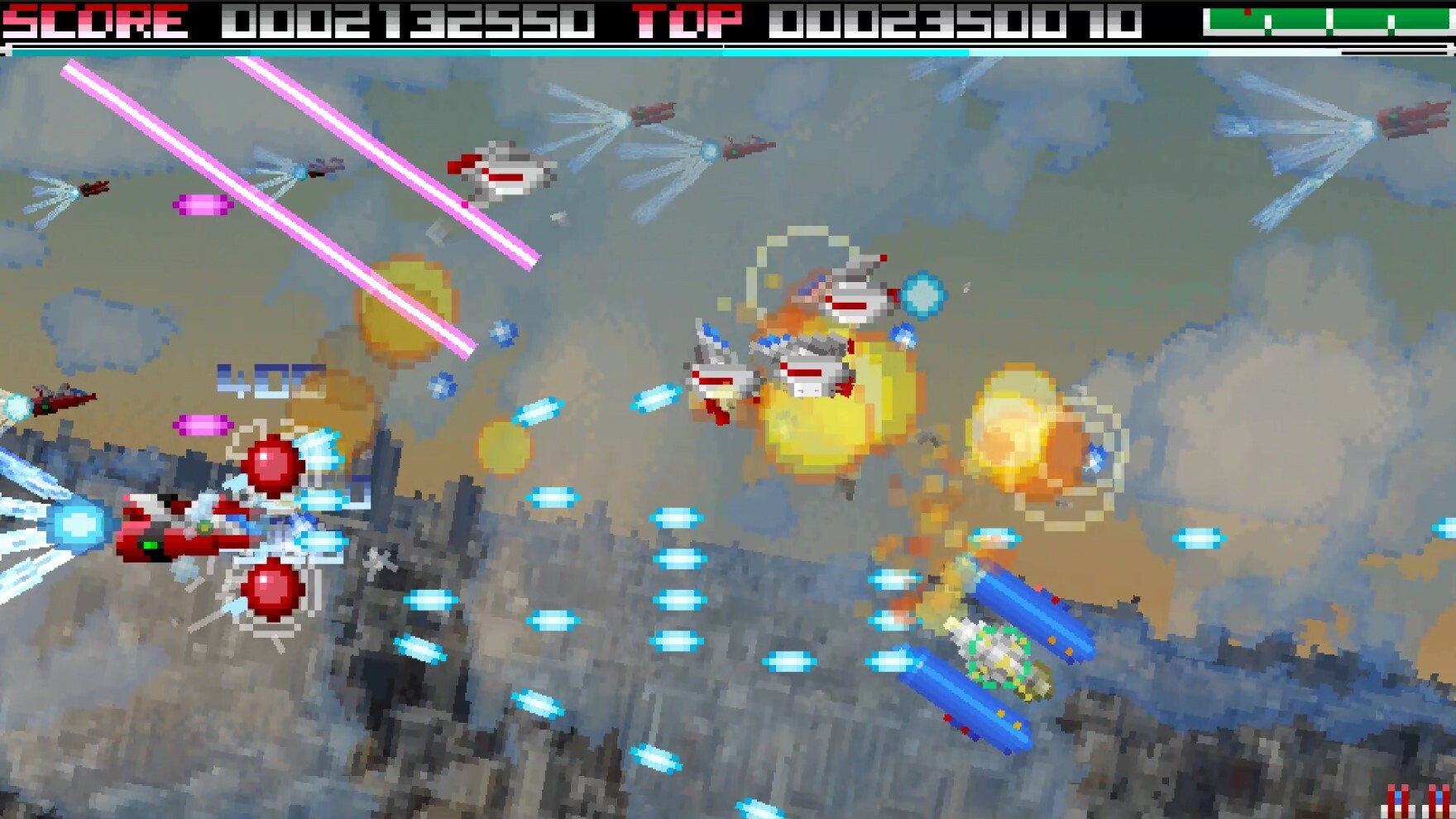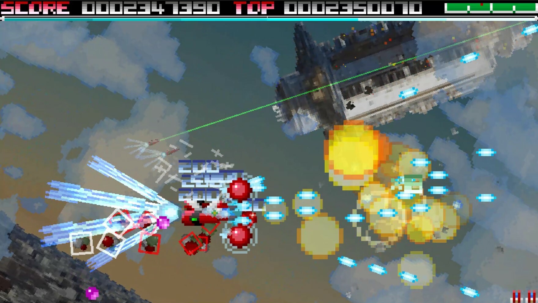 During the first hyper stage, your aircraft's attack will be changed to laser and the enemy's points will be doubled.