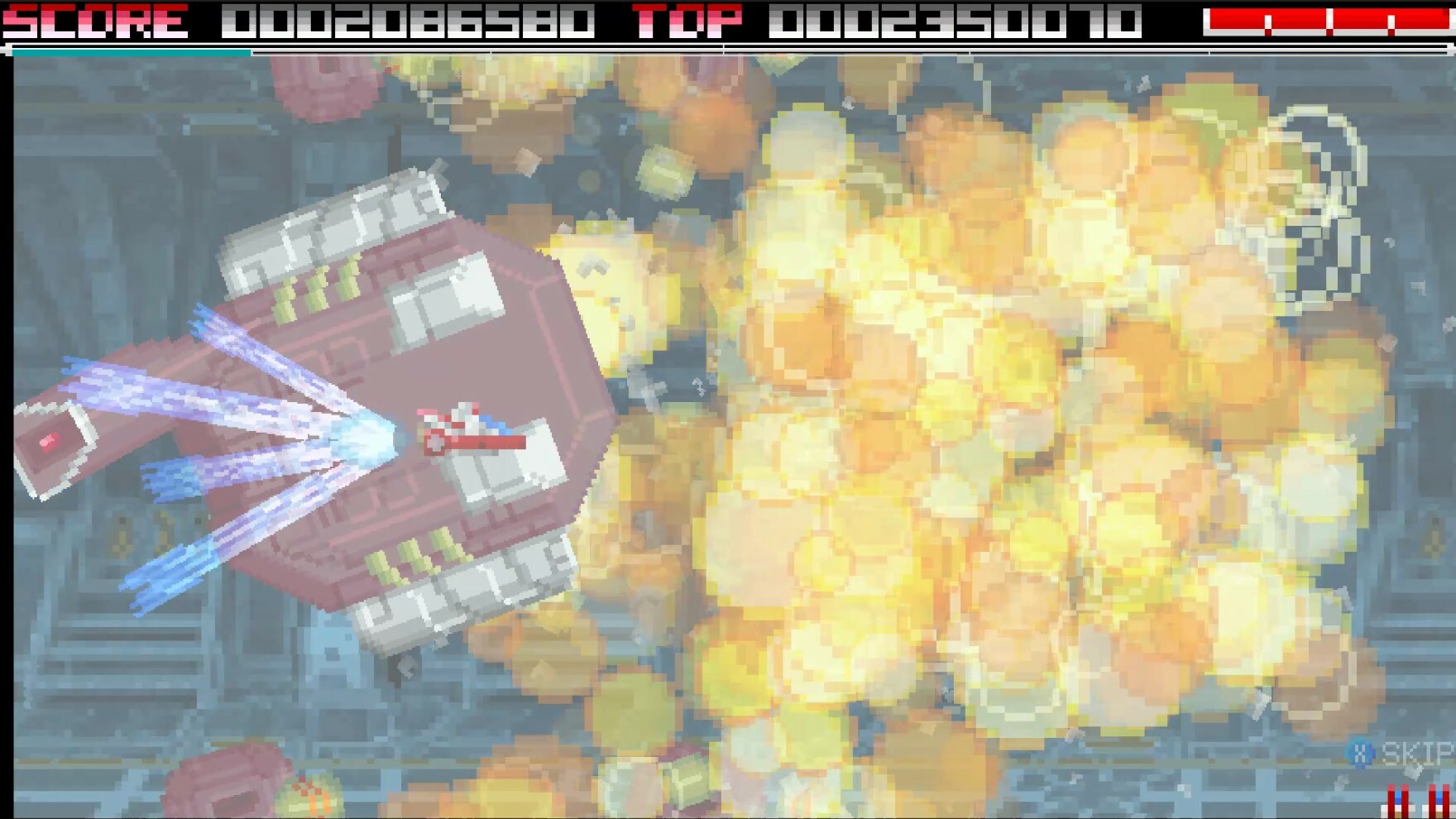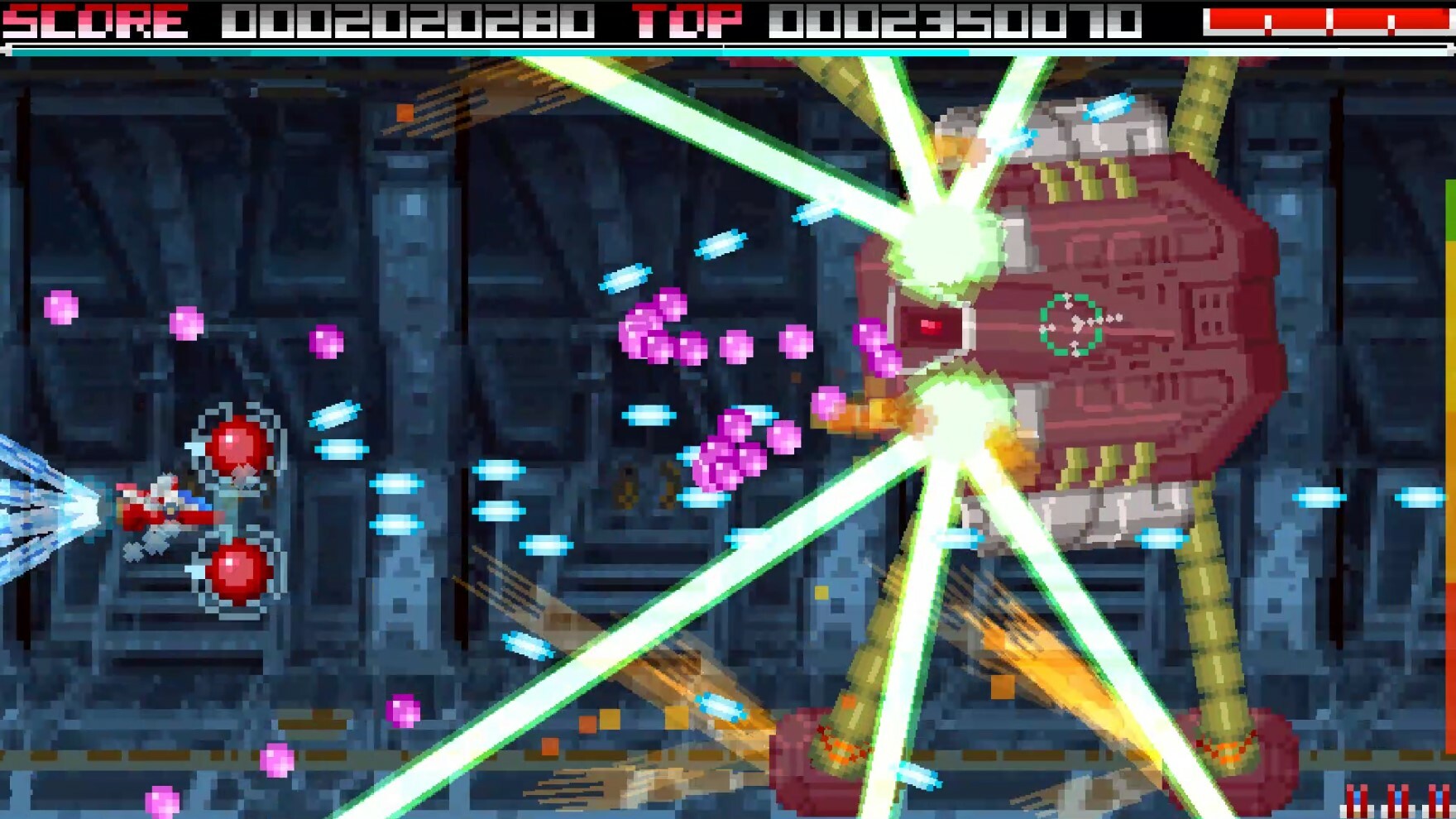 The hyper laser can collide with the laser of a boss or large enemy, and energy items will be released during the collision. Also, the energy ball generated by the collision deals a lot of damage to the enemy.