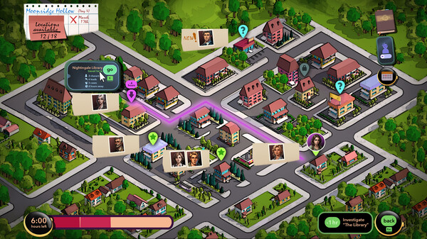 Explore the town of Moonridge Hollow in search of clues. At each location you will need to use your sense of observation to spot anything out of the ordinary that could help in unraveling the mystery. But beware of red herrings that can throw you off the scent!Interrogate Suspects