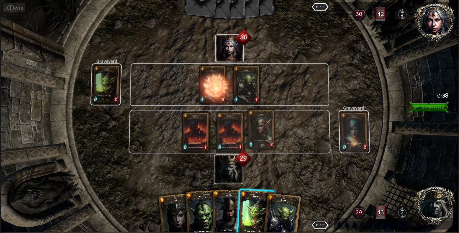 Each Realm boss starts with 30 health, each turn you gain an extra mana which means you can play better cards as the rounds go on. As you battle, you don't just have to defeat the boss, you have to defend from the enemy players cards which have been played.
