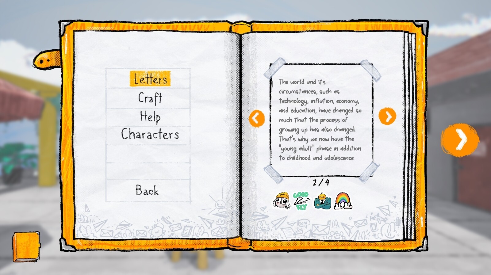 Additionally the players can write messages and send them to other players. Here, own thoughts can be written down and decorated with stickers. Writing and sending these messages can take place at any time during the course of the action. With the help of a scrapbook that can be accessed at any time, the player can send messages and read and store collected paper planes.