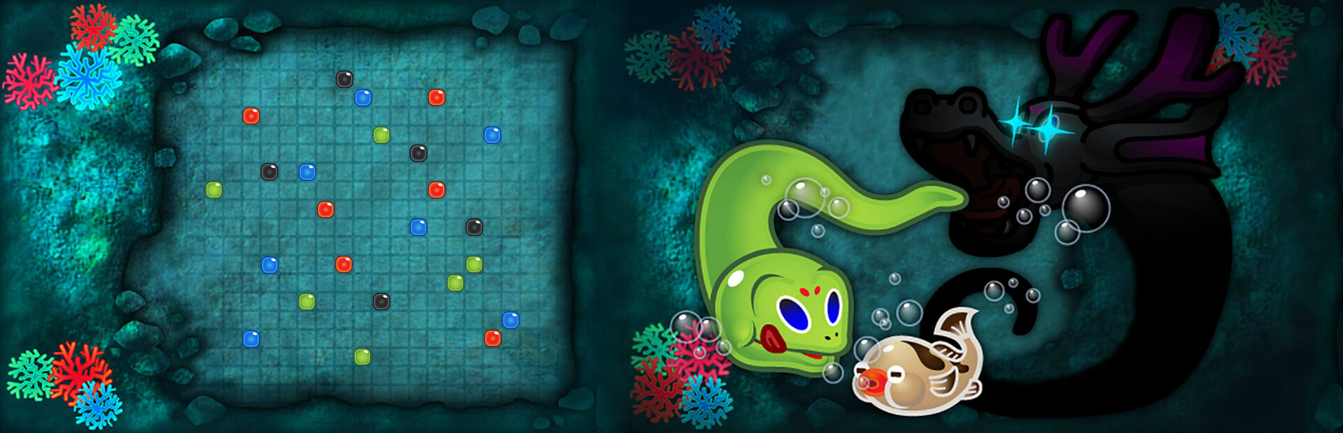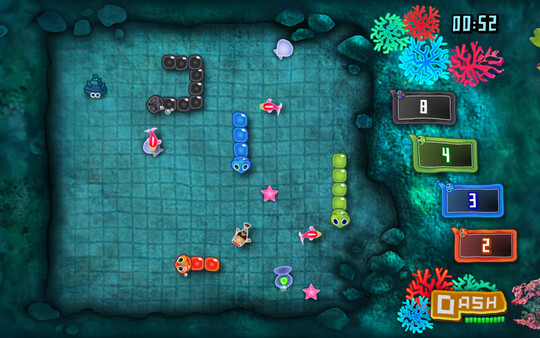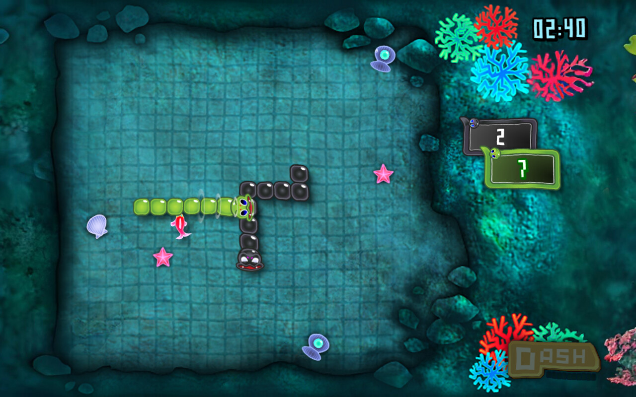 There are many creatures in the deep to snack on, but be careful. The delicious pufferfish sometimes swells up revealing poisonous spines. If you are eaten, and reduced to a small fry, find a pearl from one of the shells on the sea floor to return to snake form.