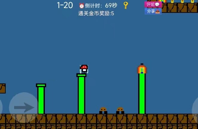 The game contains a variety of items, such as spring, gravity control, weapon, iron head, iron shoes, shell, handgun, consecutive jumping, teleportation portal, and so on.