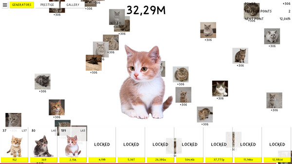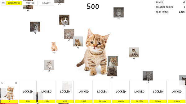 CATS CLICKER is a simple idle clicker game with cute kittens and amazing cats. Click the pussy make money. Use it to unlock generators and buy upgrades. Unlock hundreds of cats and discover all prestige upgrades.