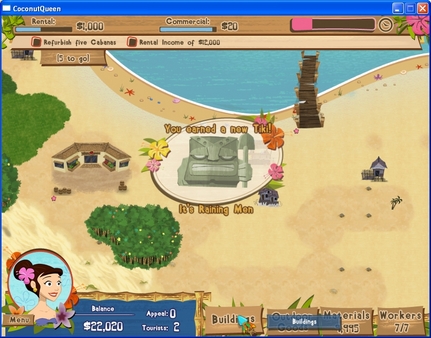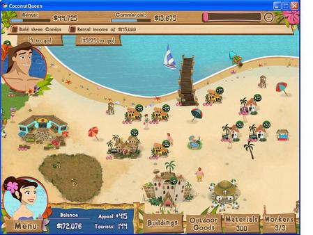 In Coconut Queen verlockt Sie die Insel Lui Lui an den meilenlangen, sonnigen Str?nden zu verweilen. Tauchen Sie in die farbenpr?chtige Pflanzenwelt ein und entdecken Sie Ihre Berufung zur sehns?chtig erwarteten Coconut Queen. Auf Ihrem Inselparadies mangelt es an weiblichen Konkurrentinnen und die st?mmigen Ureinwohner verw?hnen Sie mit gen?sslichen Fr?chten. Wo liegt der Haken an diesem Schlaraffenland? Eine kleine Sache: Sie m?ssen Lui Lui in ein idyllisches Touristenparadies verwandeln, oder Sie sind dem Untergang geweiht.