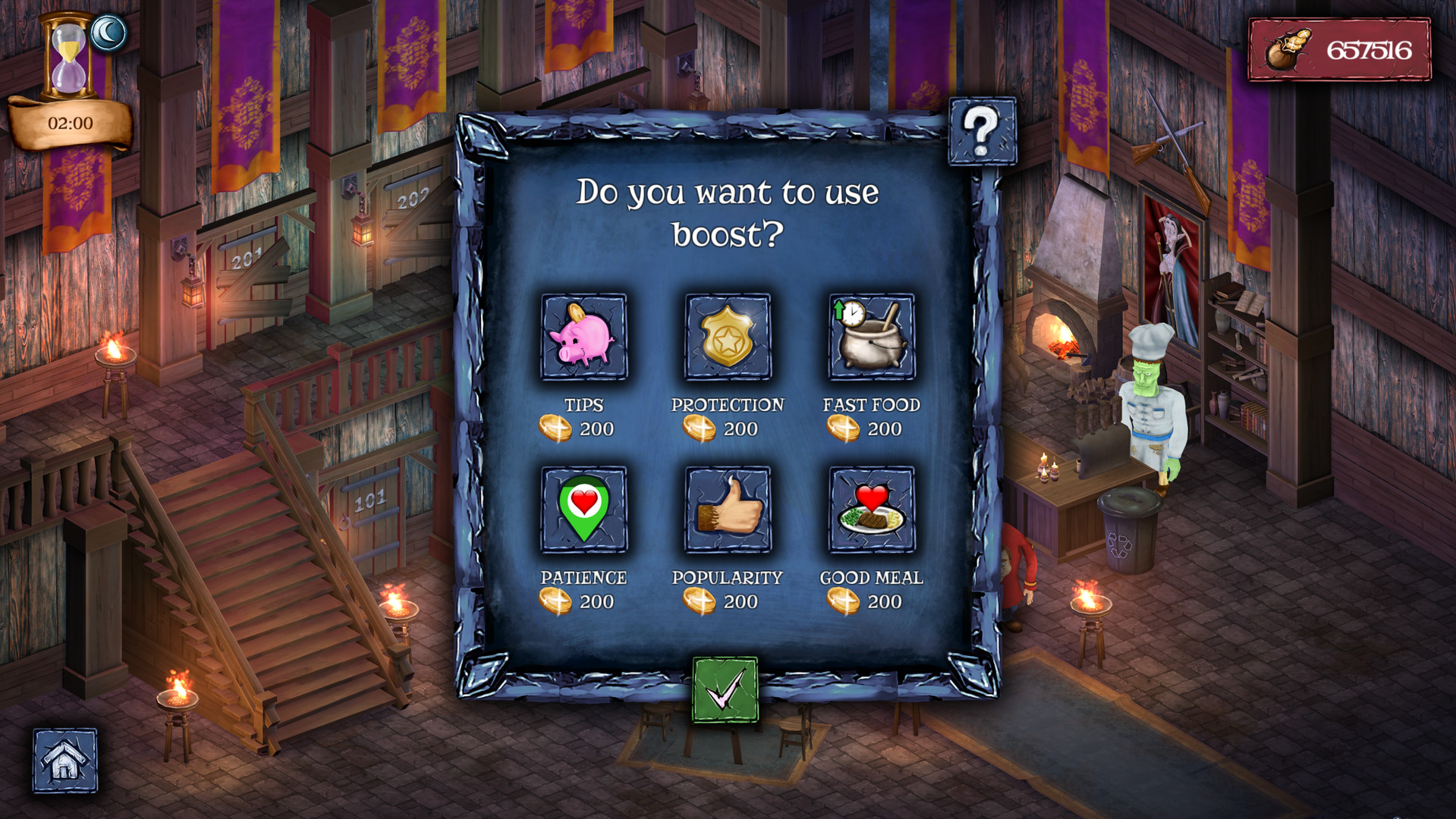 In addition in the the hotel we have two mini games available, where you can relax and earn a few gold coins when we are missing some to buy new equipment. There are "Dracula Gallery" and "Unusual Order". In "Dracula Gallery" paintings are not only rear-facing forward, but also we need to find double images. When we select all the images for our pair, the game ends. But the number of moves is limited. In the game "Unusual Order" we have to collect the ingredients falling on the stew, trying not to miss any ingredient, but also considering that to our pot did not fall dirty sock or even more bomb. Caught sock punish with the penalty points and the bomb immediately ends the game.