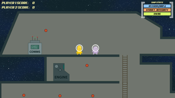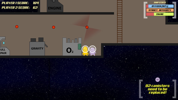 Within your space ship, there are 7 stations. These stations all do one specific job that contributes to keeping you, your space buddy and all your hopes and dreams alive. Therefore, it would be best to maintain all the stations. This is obviously easier said than done. Some stations will eventually break down due to unknown reasons and it is up to you two to fix them! If the ship's structural integrity hits 0% or the O2 levels hit 0%, you are dead. It's game over. Rack up points by making repairs and see how far you and your buddy can make it.