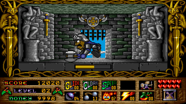 Fight your way through 16 levels with diverse scenarios, including medieval castles and mountains. Spread throughout the levels are shops in which you can buy potions and other magical items to help you along the way. Before you finally face the Dark Lord Loki, you must also defeat the 8 Apprentices of Darkness.