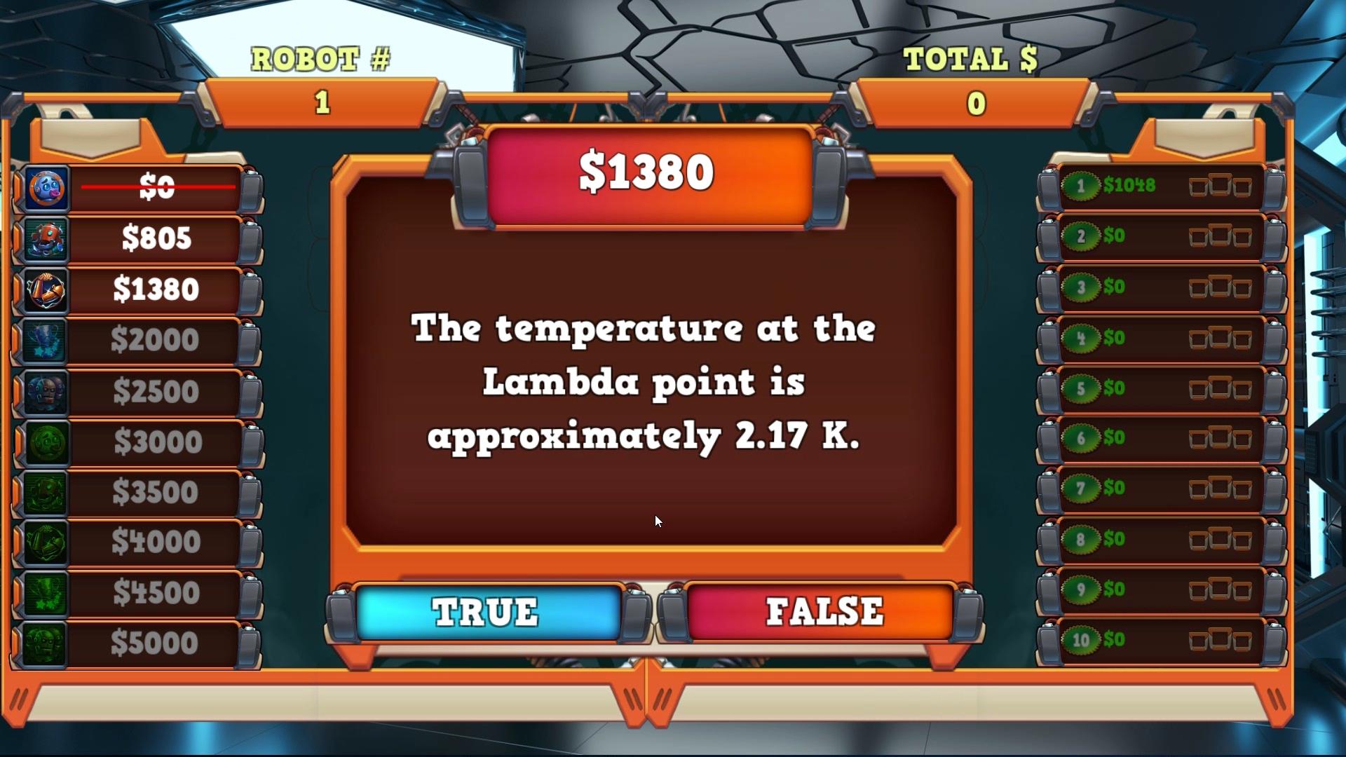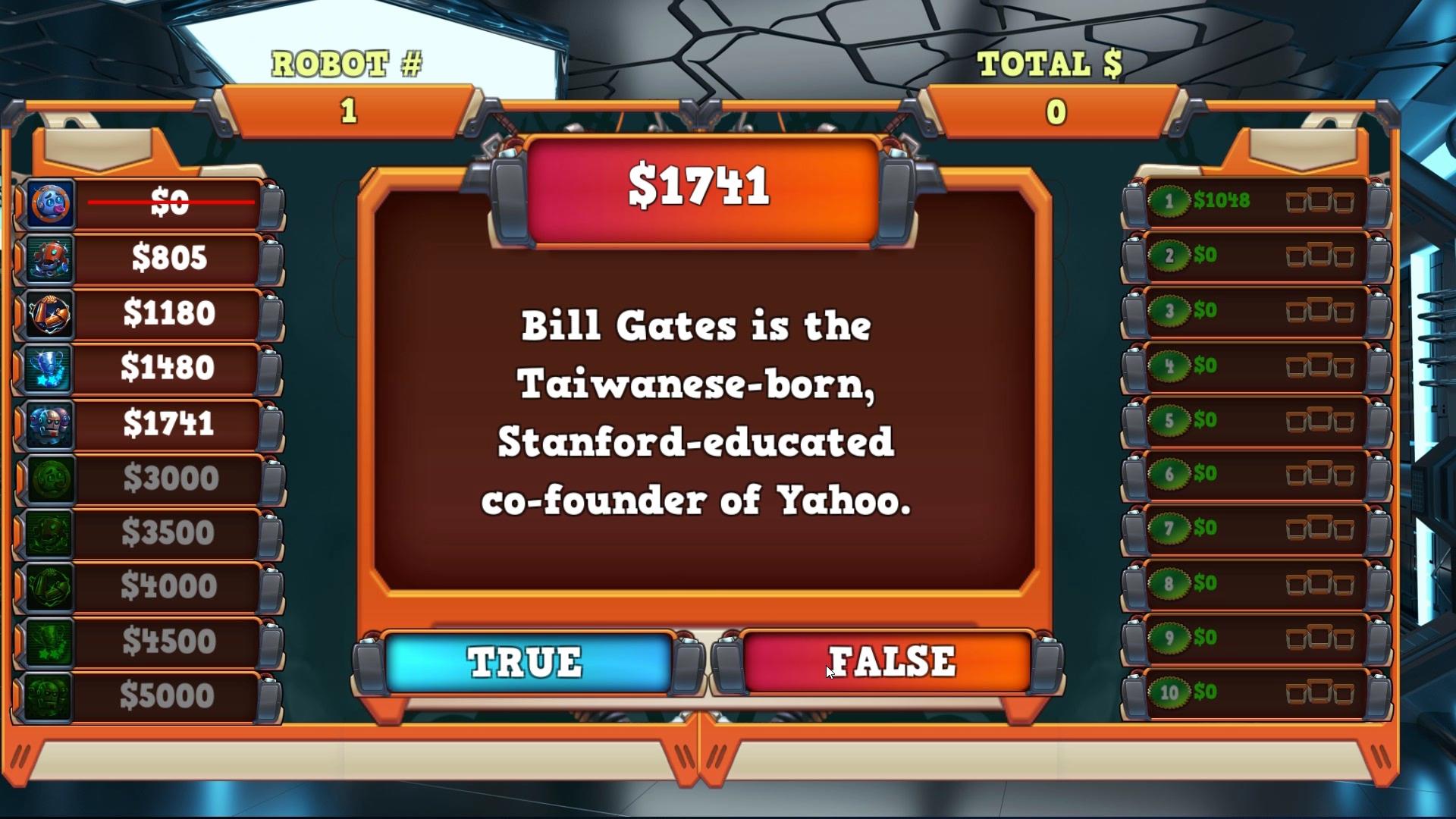 Crankies Workshop is a true or false question game with a colorful and friendly atmosphere. Crankie needs help assembling his new order of Grizzbot's and he needs you to answer the knowledge machines questions to keep it assembling the robots. He will show you the ropes and then set you loose on all 10 levels consisting of 10 questions per level. Each question you answer is a stage in the robots assembly and has a dollar value based on the speed you answer correctly. The overall value of each of the 10 completed robots(levels) is tracked and assigned a rating of 1,2,3 by Crankie so you can see yourself progress and try and beat previous scores.