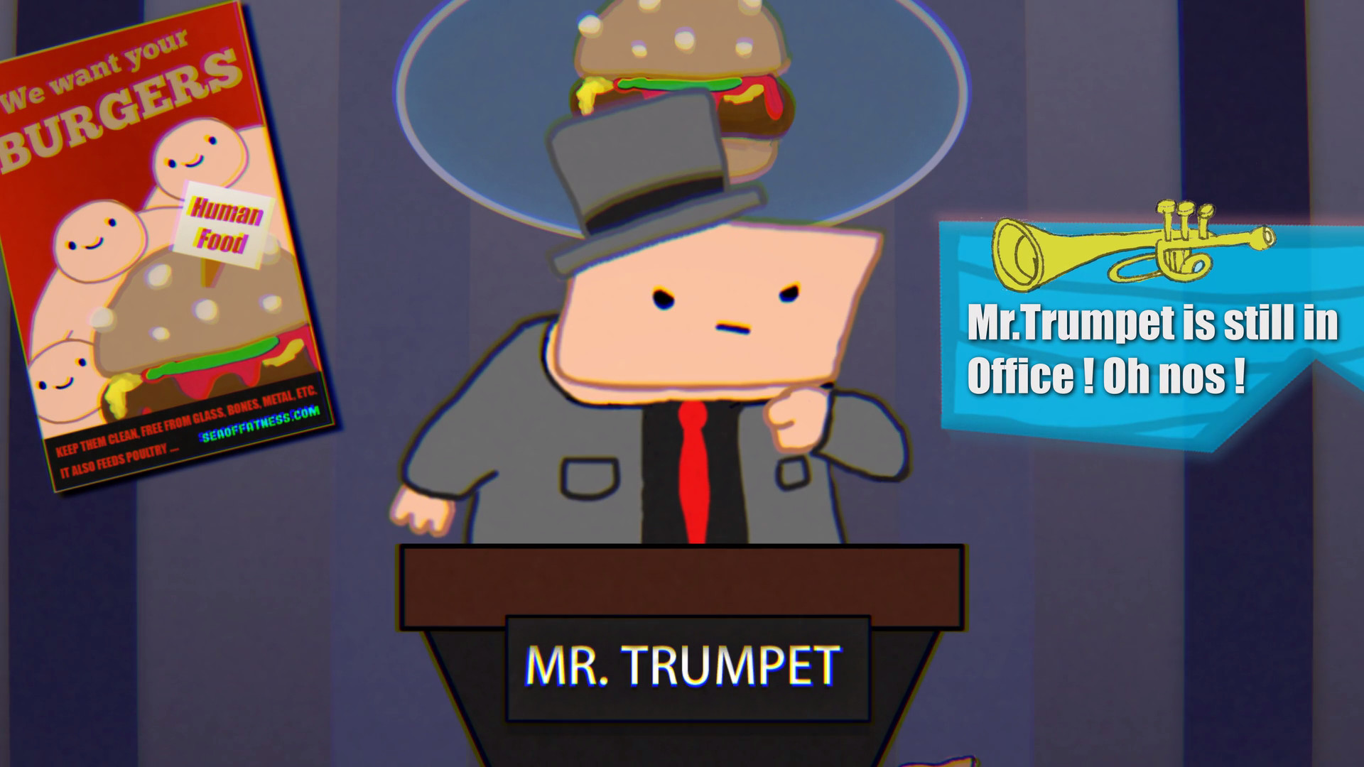 Sea of Fatness is a dystopian game about a future reigned by fat and Mr. TrumPET. Only you, and the power of burgers and apples can save the world from this man. Sink Mr. TrumPET's holy ark before he grabs the money and escapes to Cuba.