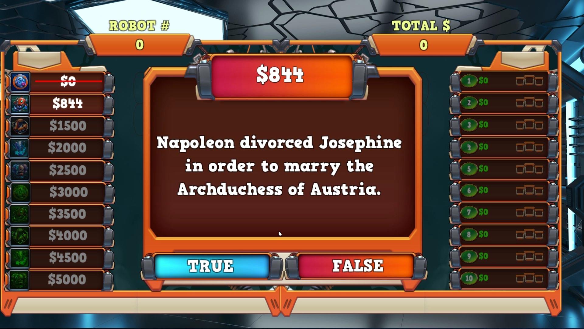 Crankies Workshop is a true or false question game with a colorful and friendly atmosphere. Crankie needs help assembling his new order of Freebot's and he needs you to answer the knowledge machines questions to keep it assembling the robots. He will show you the ropes and then set you loose on all 10 levels consisting of 10 questions per level. Each question you answer is a stage in the robots assembly and has a dollar value based on the speed you answer correctly. The overall value of each of the 10 completed robots(levels) is tracked and assigned a rating of 1,2,3 by Crankie so you can see yourself progress and try and beat previous scores.