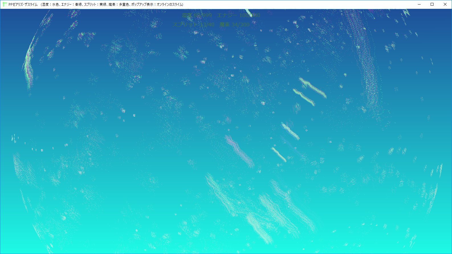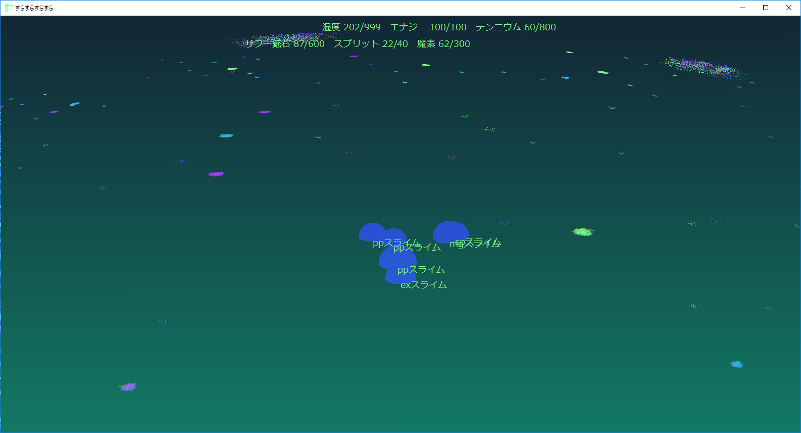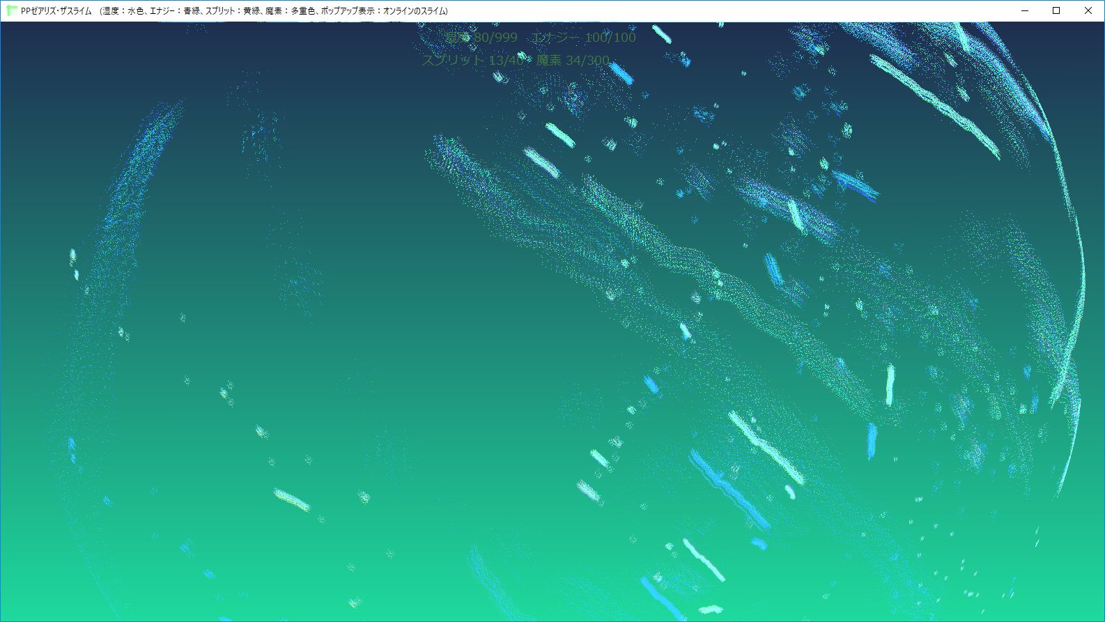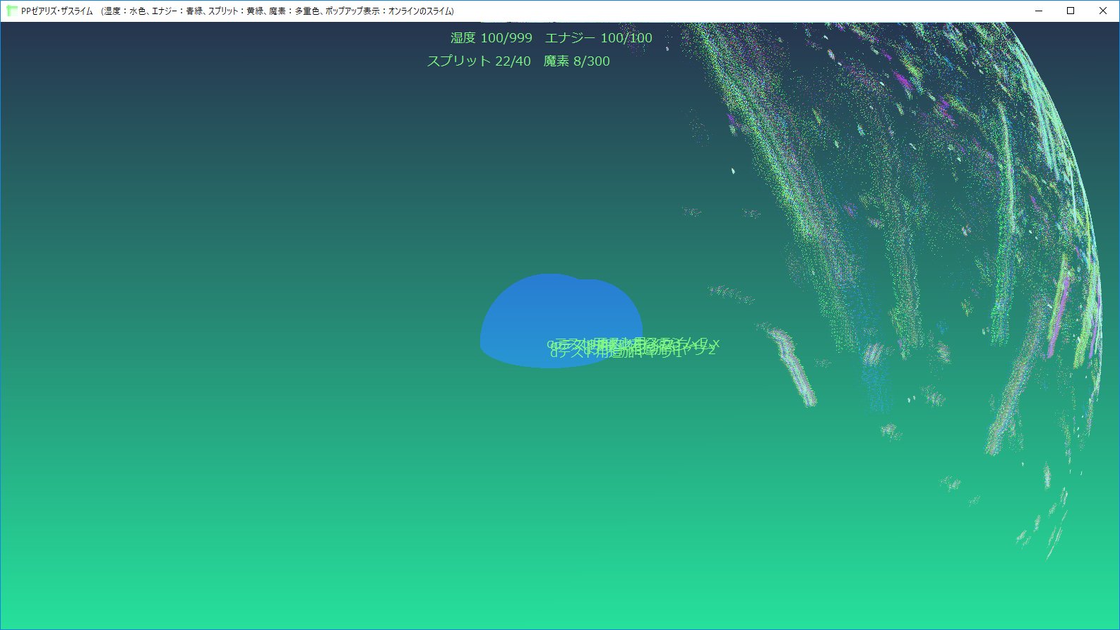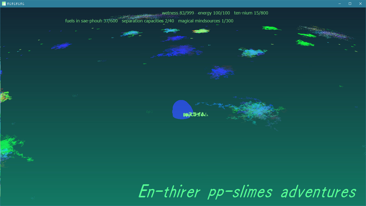 Particles mean resources in this game. In Increasing player's resources on the situation that pp-slimes close them. Those resources provide mgt-slimes(separatable), fused ex-slimes and sp-slimes they're good at combat against other slimes-tribes. Also, resources grown up themselves, enabled self-increasing amount of resources contained.